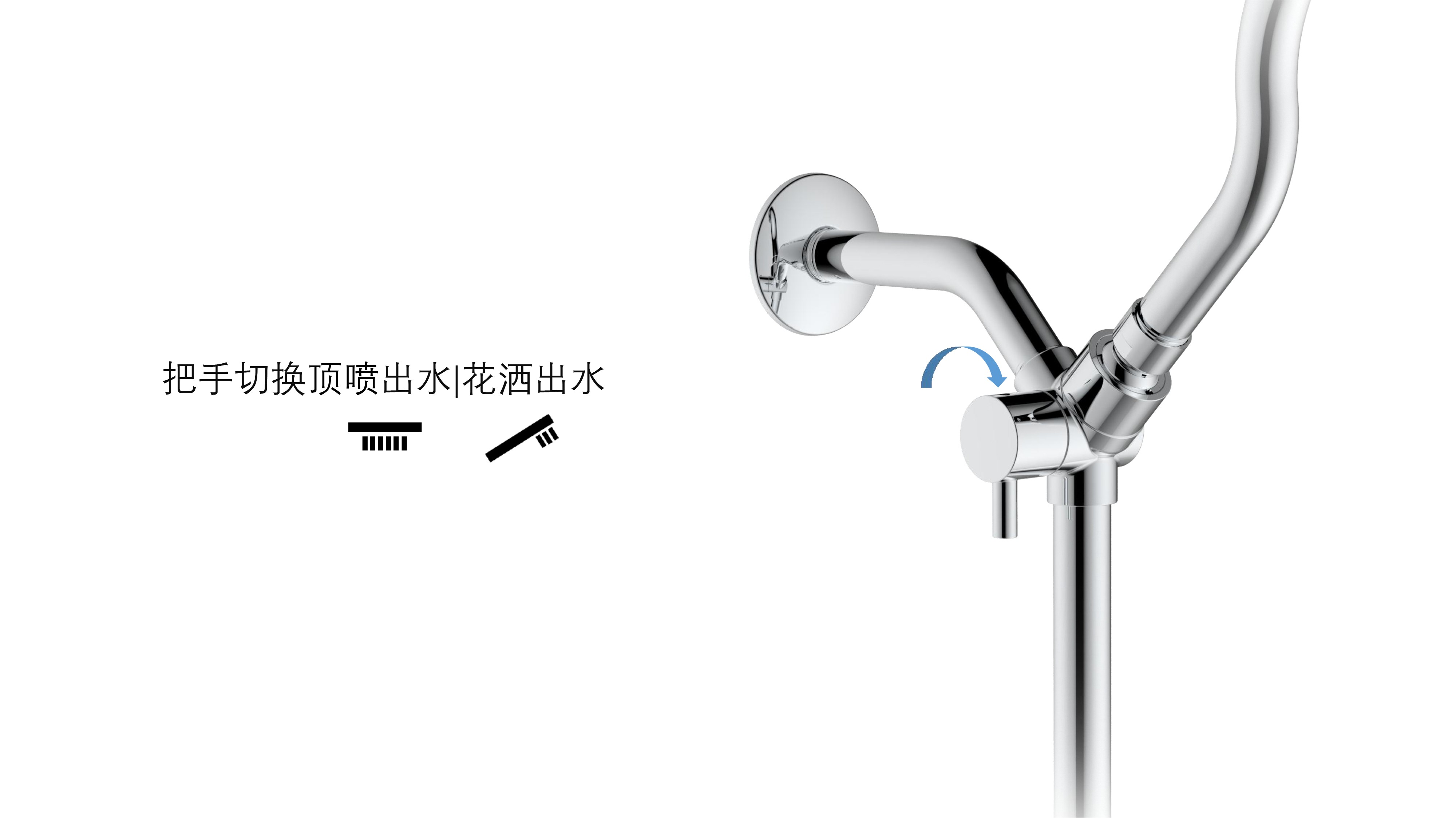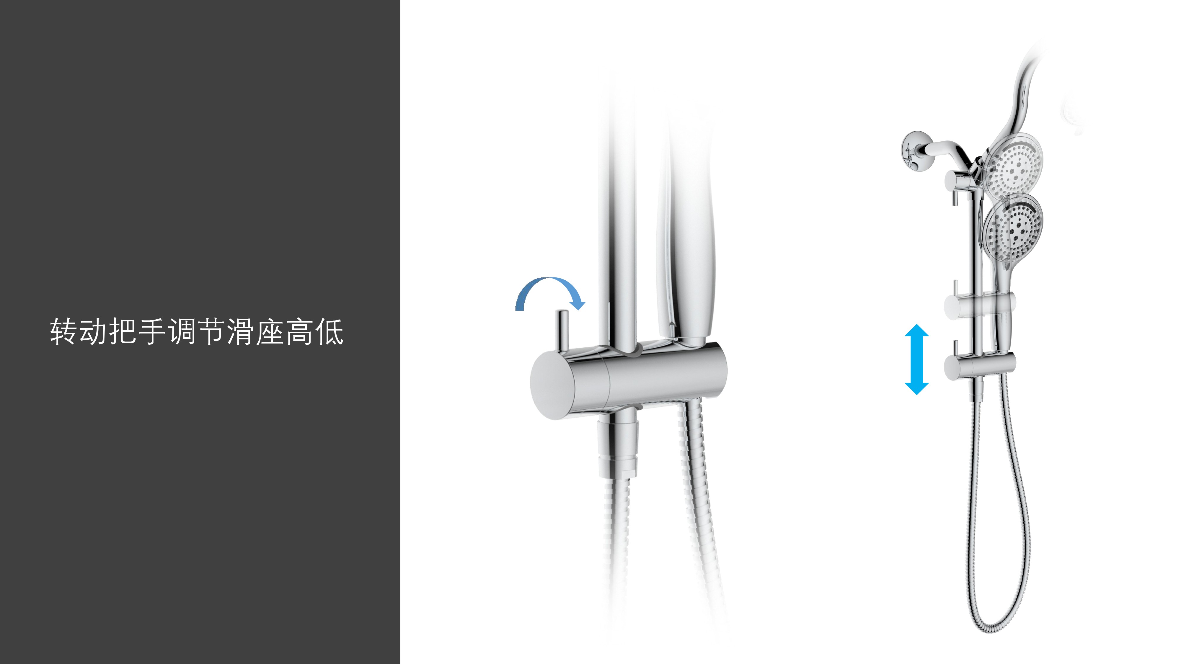 上出水彎管套裝;頂噴內置球頭,可實現(xiàn)多角度旋轉調整;把手切換頂噴出水、花灑出水;轉動把手調節(jié)滑座高低