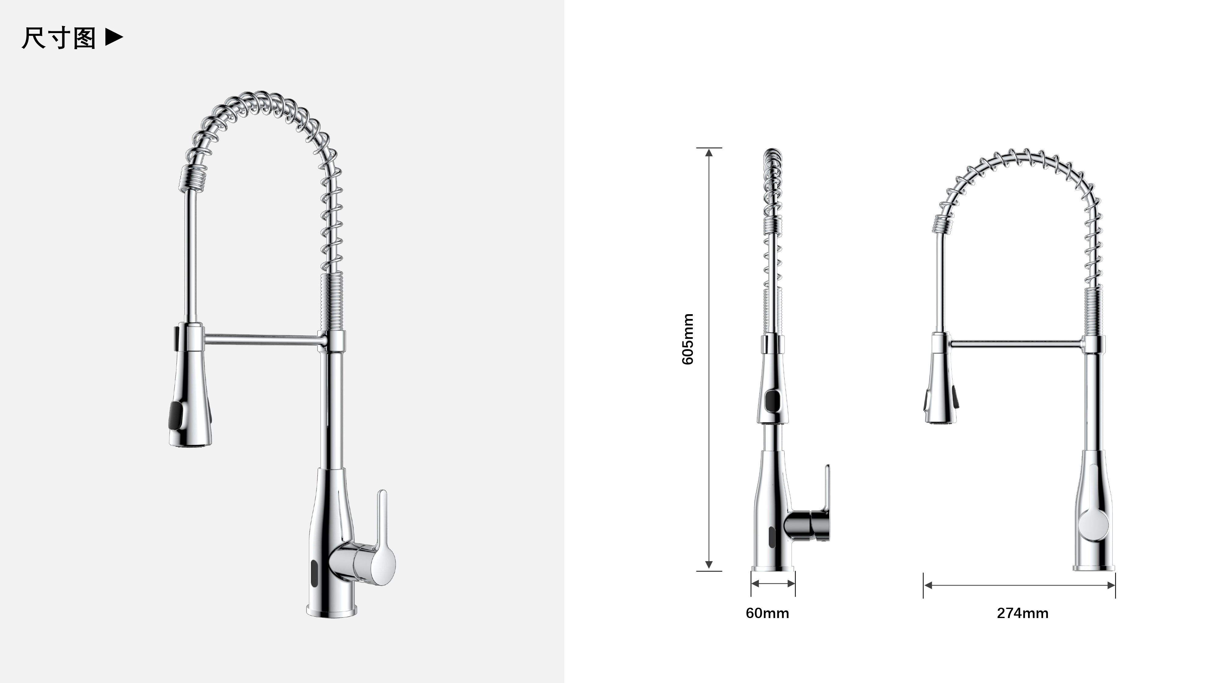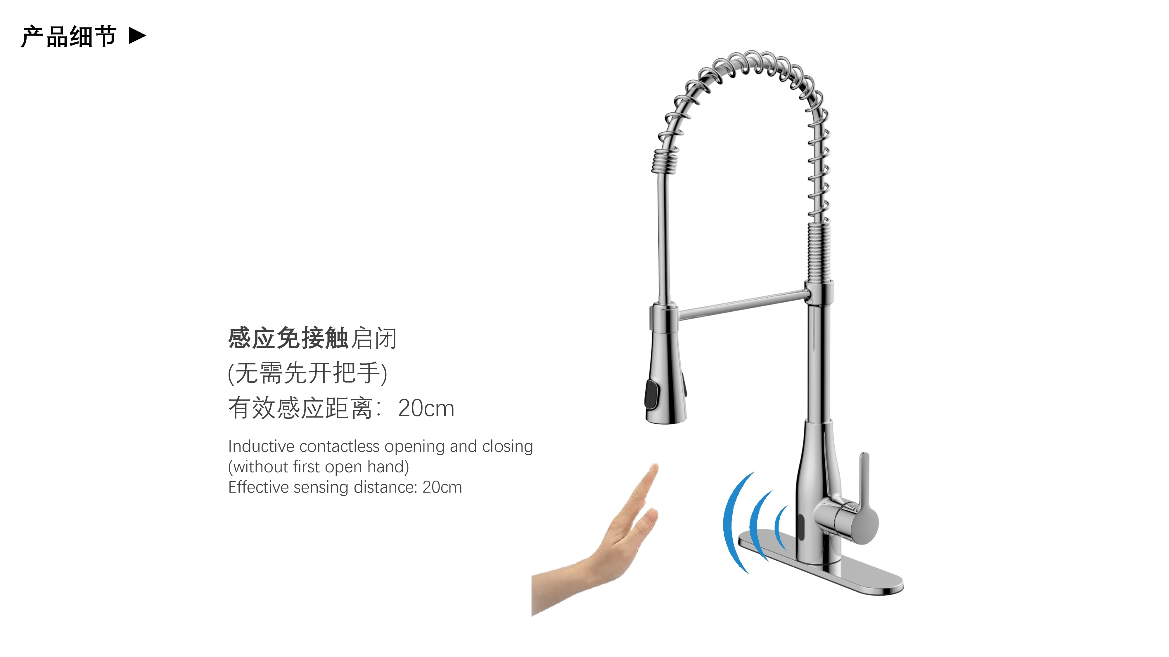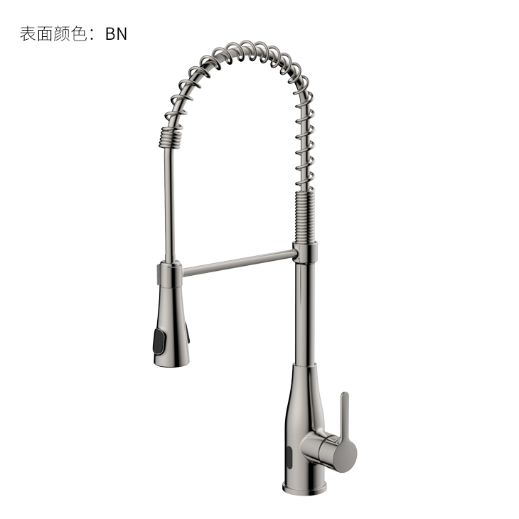 雙控廚房龍頭 ;感應(yīng)免接觸啟閉,有效感應(yīng)距離20cm;智能芯片恒溫技術(shù)雙控盒;智能芯片溫度數(shù)顯抽拉頭-冷水TEMP顯示藍(lán)色、溫水TEMP顯示綠色、熱水TEMP顯示紅色;兩種出水抽拉頭可多角度使用