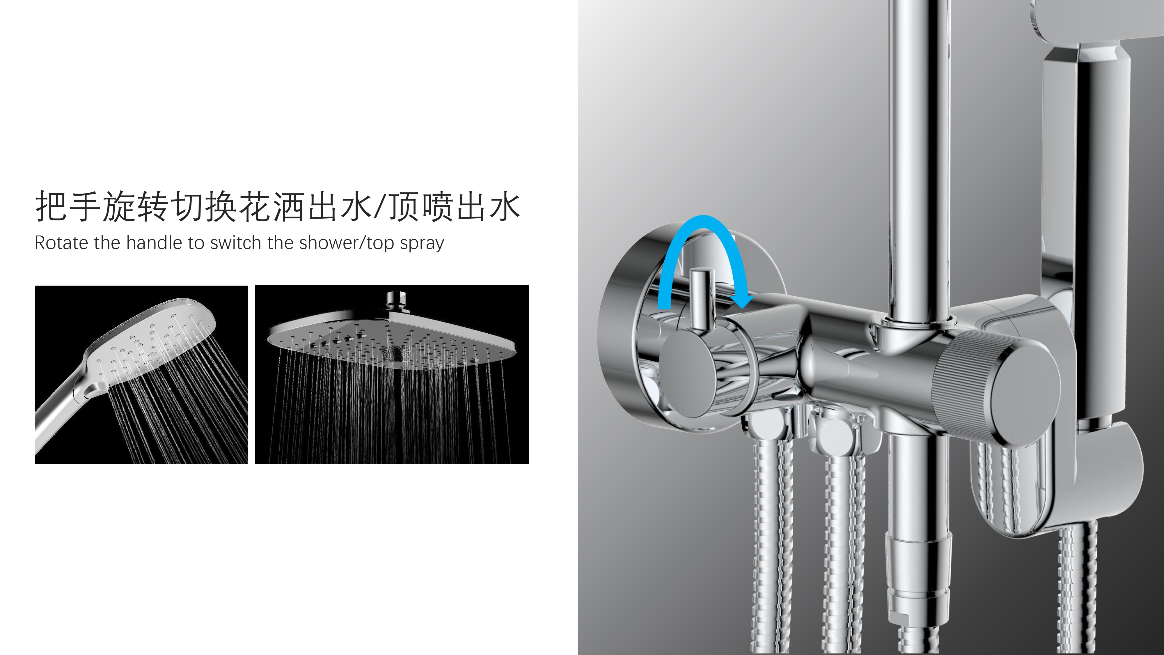 方形寬大頂噴;Z字形三通;按壓切換頂噴/花灑出水